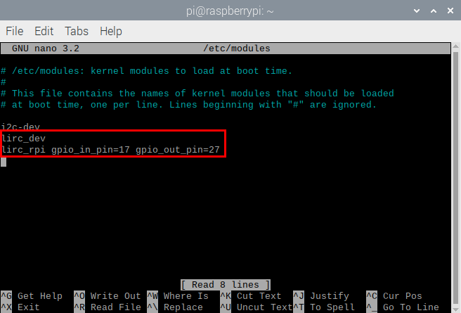 lirc_rpi gpio_in_pin=17 gpio_out_pin=27