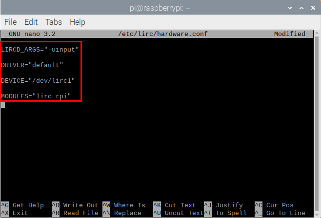 sudo nano /etc/lirc/hardware.conf아래의 네 줄을 추가해준다.