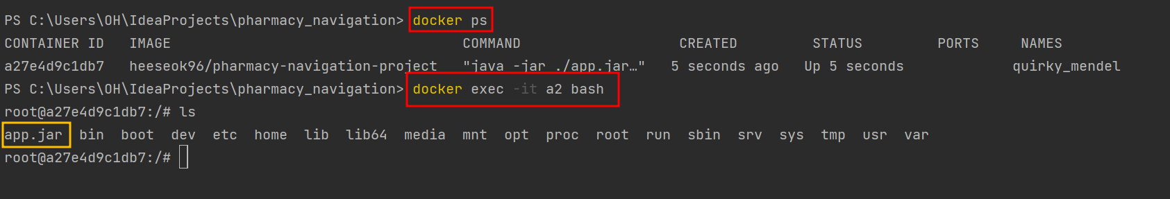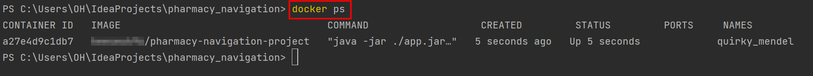 - docker container 이름을 지정하지 않았으므로 NAMES에 임의의 컨테이너 이름이 만들어진 것을 확인함