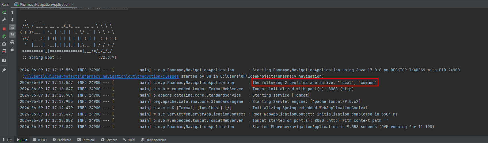 어플리케이션 실행 시, local, common profile이 실행된 것을 확인함